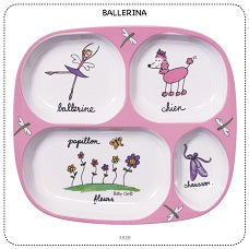 collection of plates, bowls and utensils featuring colorful graphics and french titles sturdy enough for busy kids.