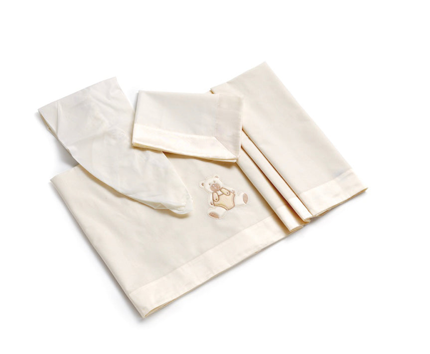 This fun ecru coloured bedding set is decorated with embroidered teddy bears. Available for both Notte Fatata cribs.
