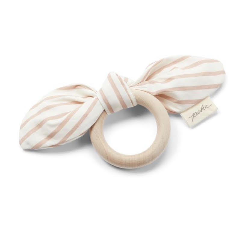 The On The Go Teether is designed to make travel with kids a little easier. This Teether is made from Sustainable FSC Maple Wood. Baby can drool, slobber and chew on the teether without worry. Just wash with warm soapy water when needed! The organic cotton bow includes a crinkly interior for added stimulation and can be taken off and thrown in the wash. Easy peasy!