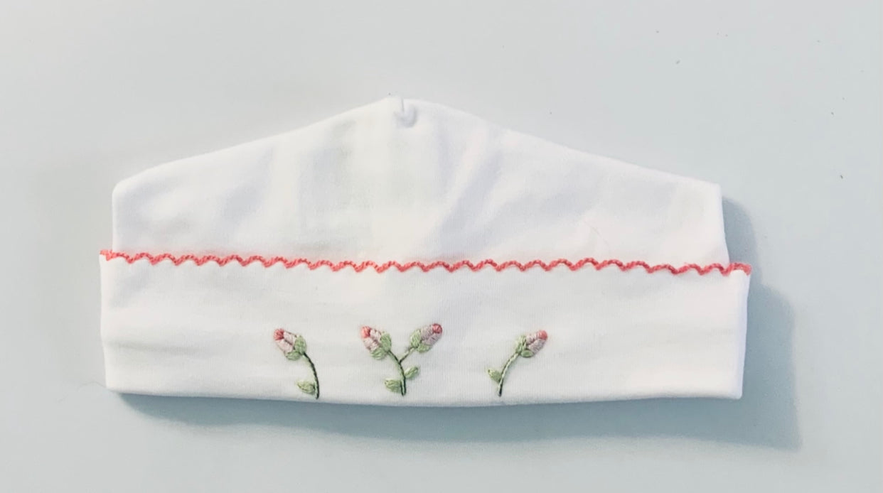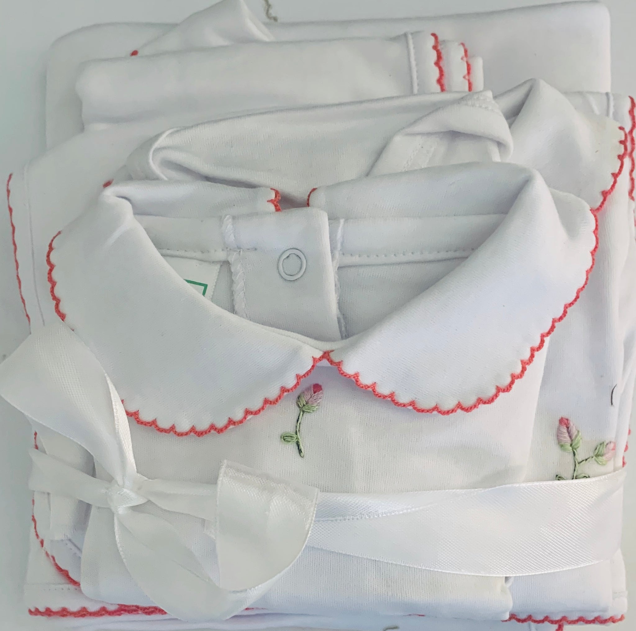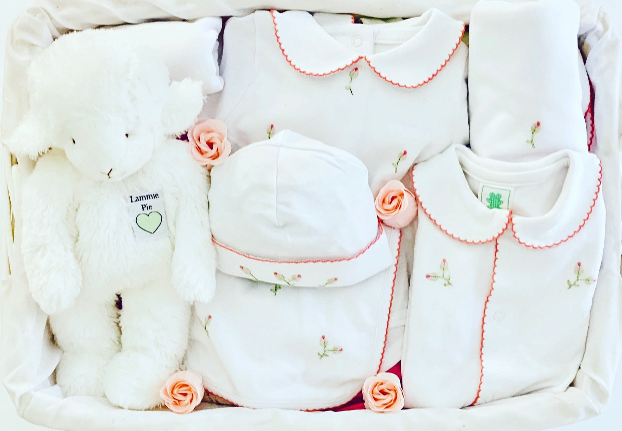 PetitTresor Luxe is proud to introduce the embroidered 'Rosebuds' layette collection. All items are made of 100% hand-picked Peruvian Cotton. Layette set includes: Footed Pajamas, Sunsuit, Receiving Blanket, Burp Cloth, Bib, Hat (hat included for NB and 3m sizes)